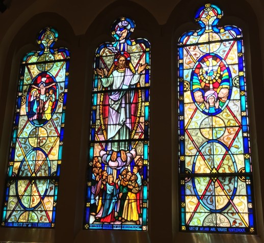 The Crucifixion, Ascension and Pentecost windows in the organ loft.